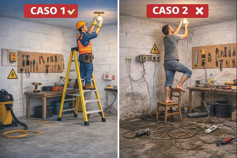 | ⚡ Electricidad 220V | Instalación normalizada, disyuntor diferencial funcionando, trabajo sin tensión | Cables pelados, trabajo con tensión, sin formación, sin EPP |